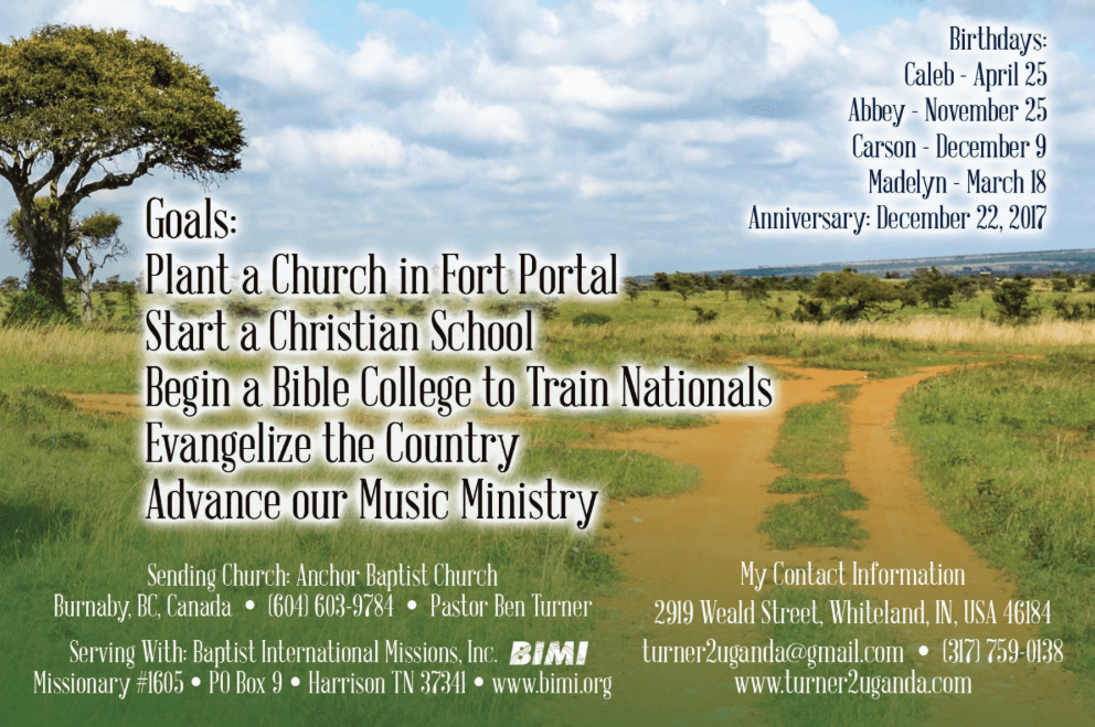 We are BIMI missionaries to the country of Uganda.